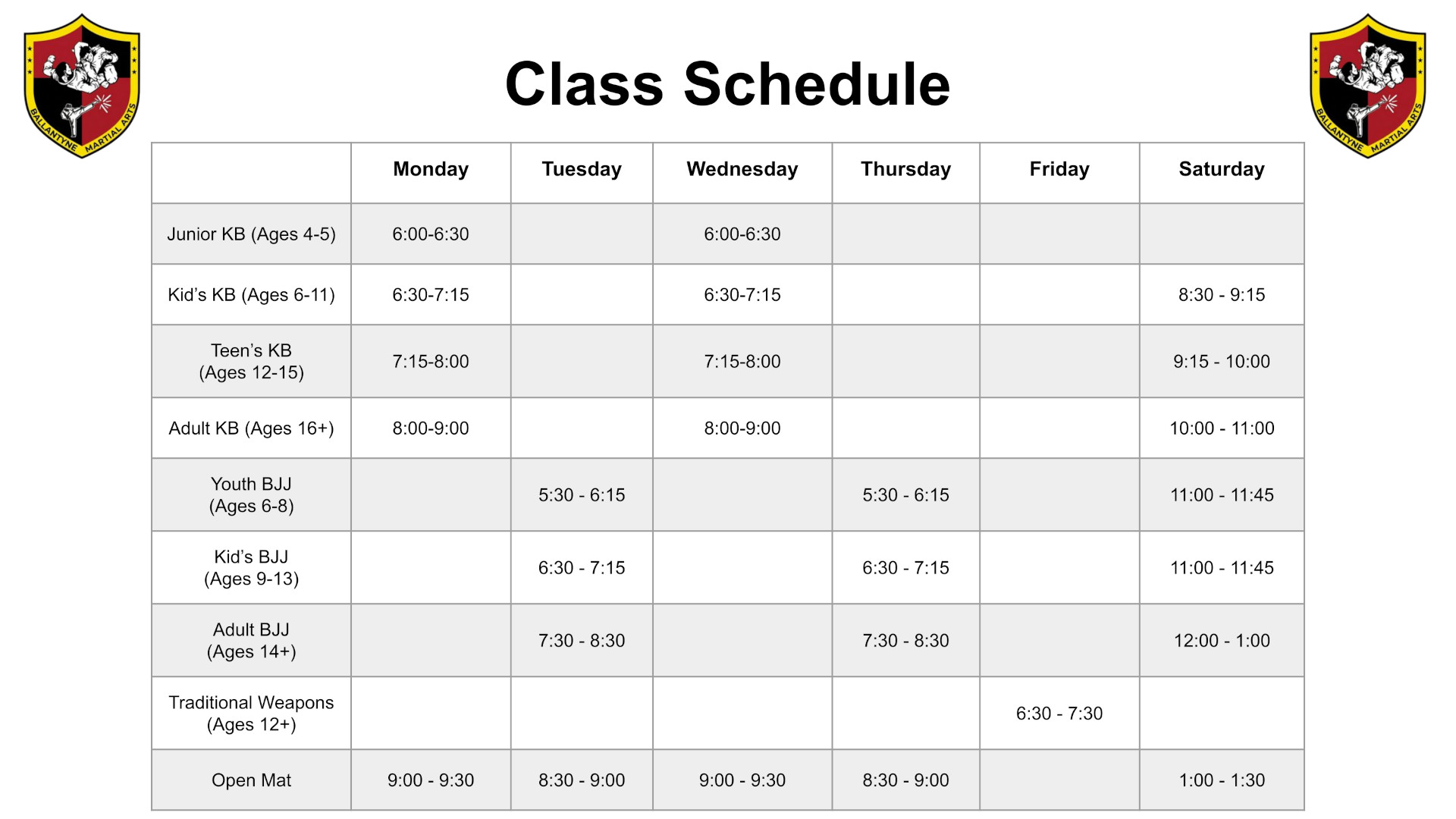 Our class schedule is structured to fit your busy lifestyle. Browse our schedule below to find a time that works for you and take the next step in your martial arts journey with Ballantyne Martial Arts.